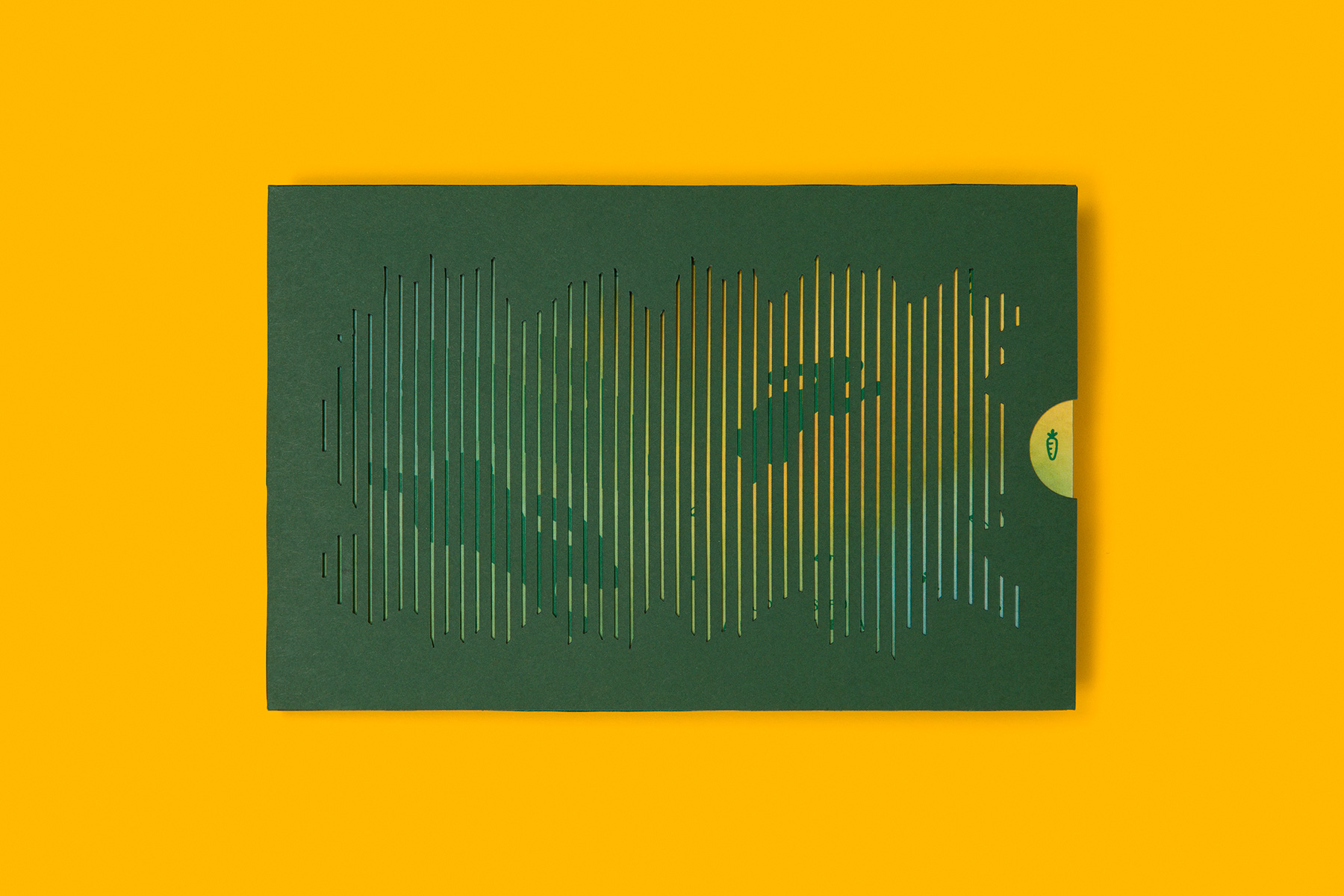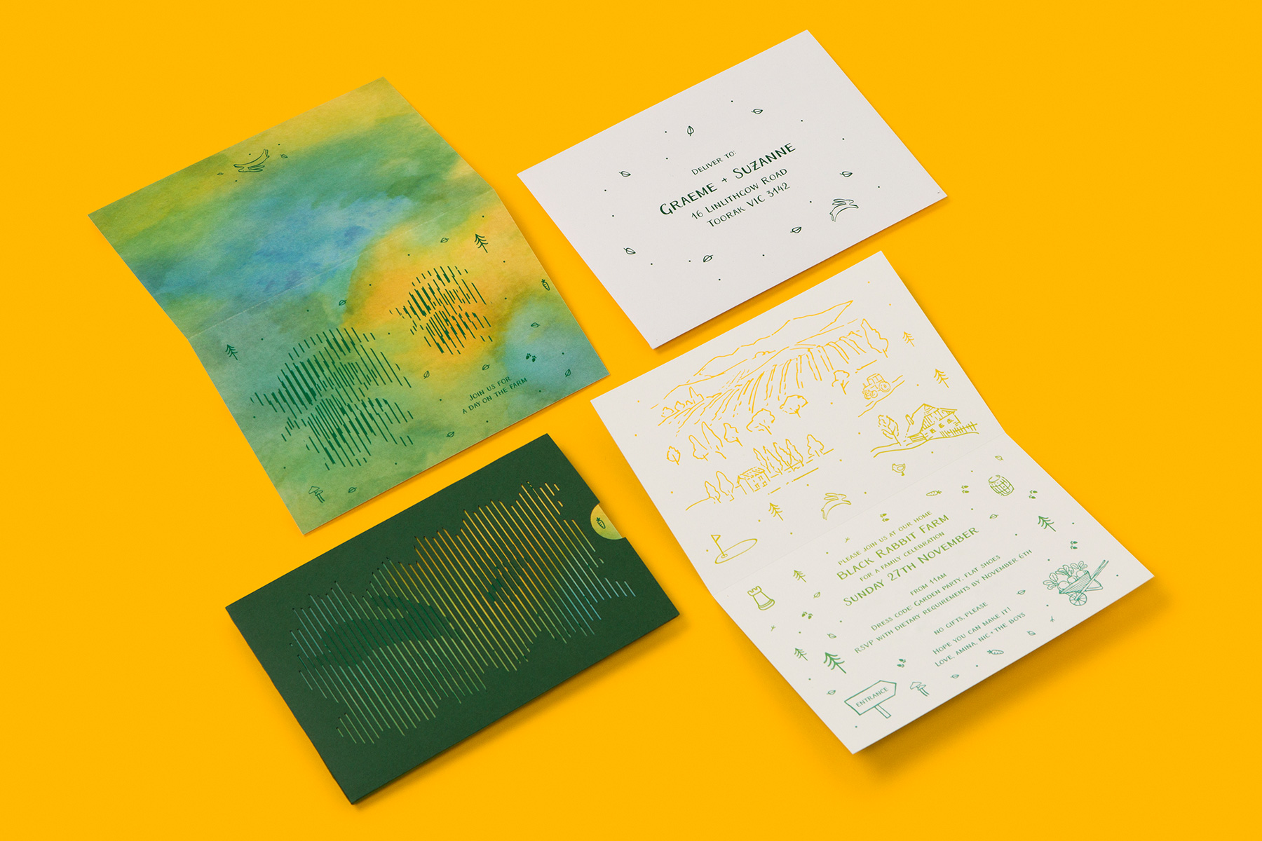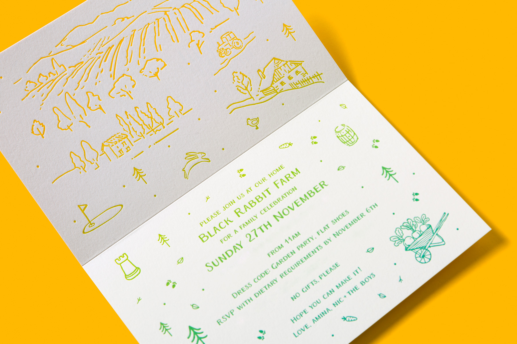 To capture the spirit of the leafy location and create a sense of discovery, we used layers of leafy green paper with foliage and other farm details. Inside, a split fountain letterpress runs from vibrant yellow to green.