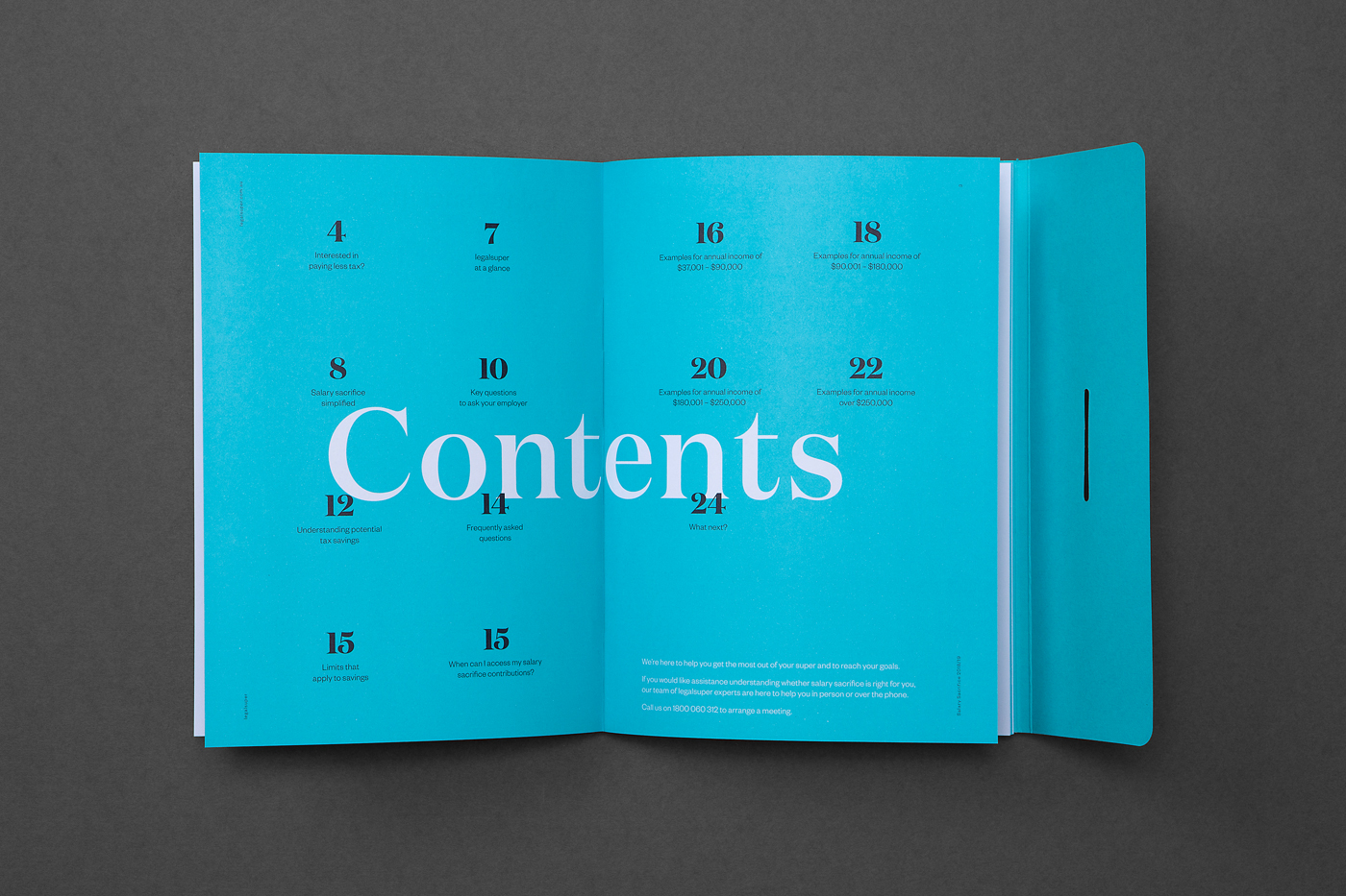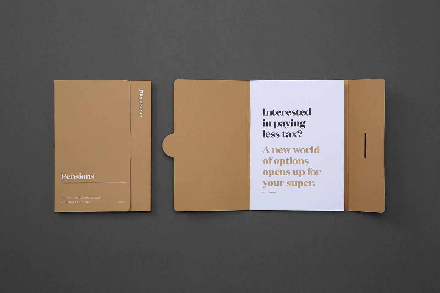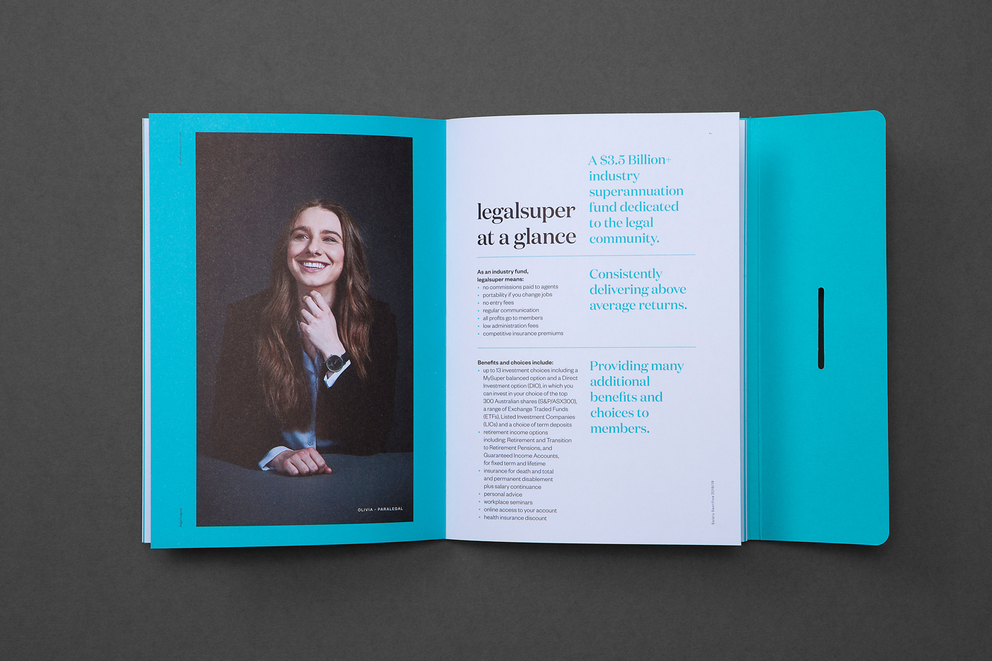 We worked with legalsuper to bring their new brand identity to life through their printed communications. Our object-based design approach looked at the materiality and form of the communication first. We explored paper stocks, sizes and how the cover interacted with the internal pages, and then we moved on to the detail and structure of the content.