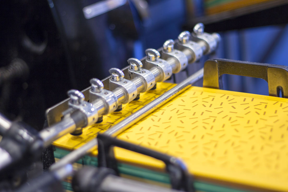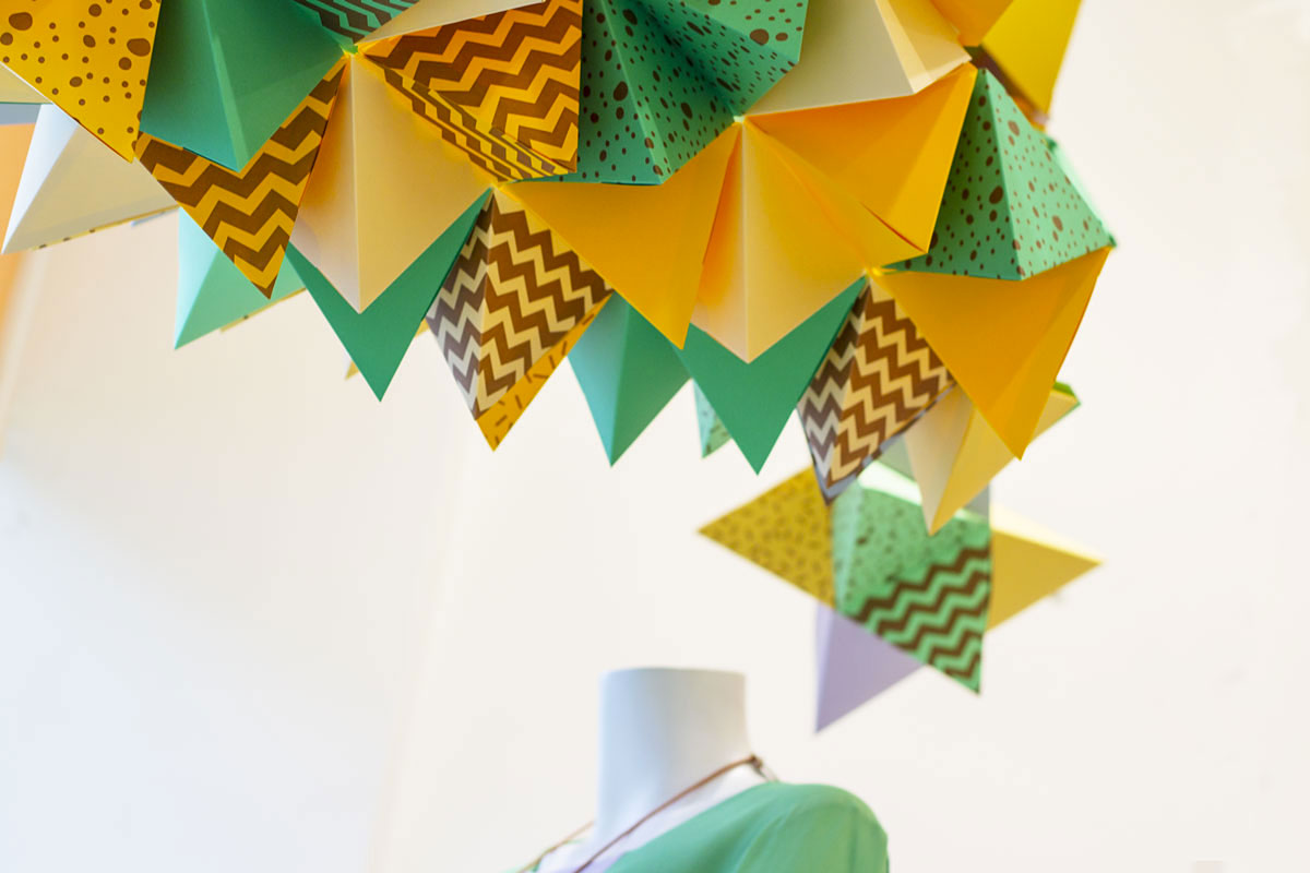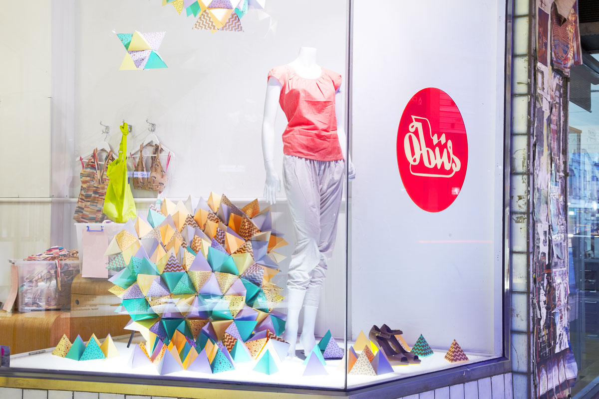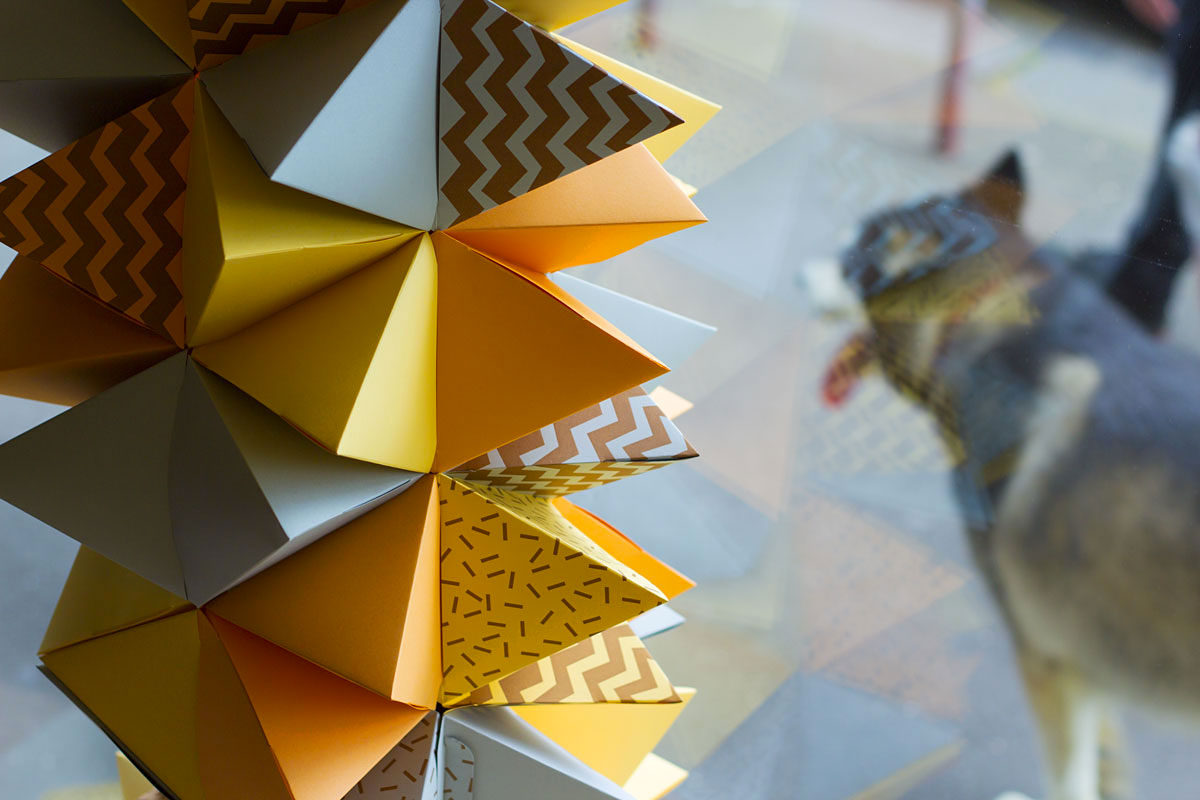 We worked closely with the Obus team, turning their multi coloured textile patterns into bronze letterpress printed multi coloured pyramids. The stock was forme cut into a modular, snap together pyramid design and assembled and installed over four days and at all four Obus locations across Melbourne. In the end we letterpress printed, cut and assembled over 2,000 triangles for the installation!