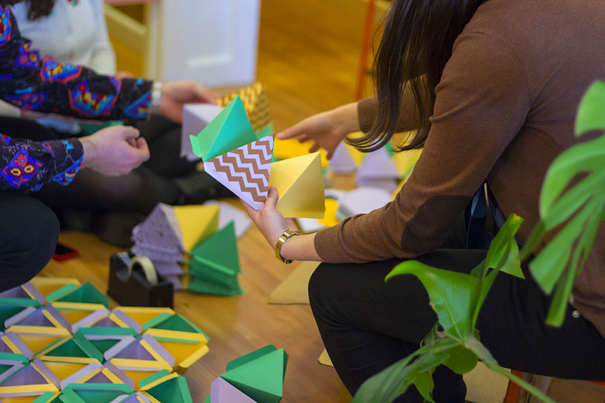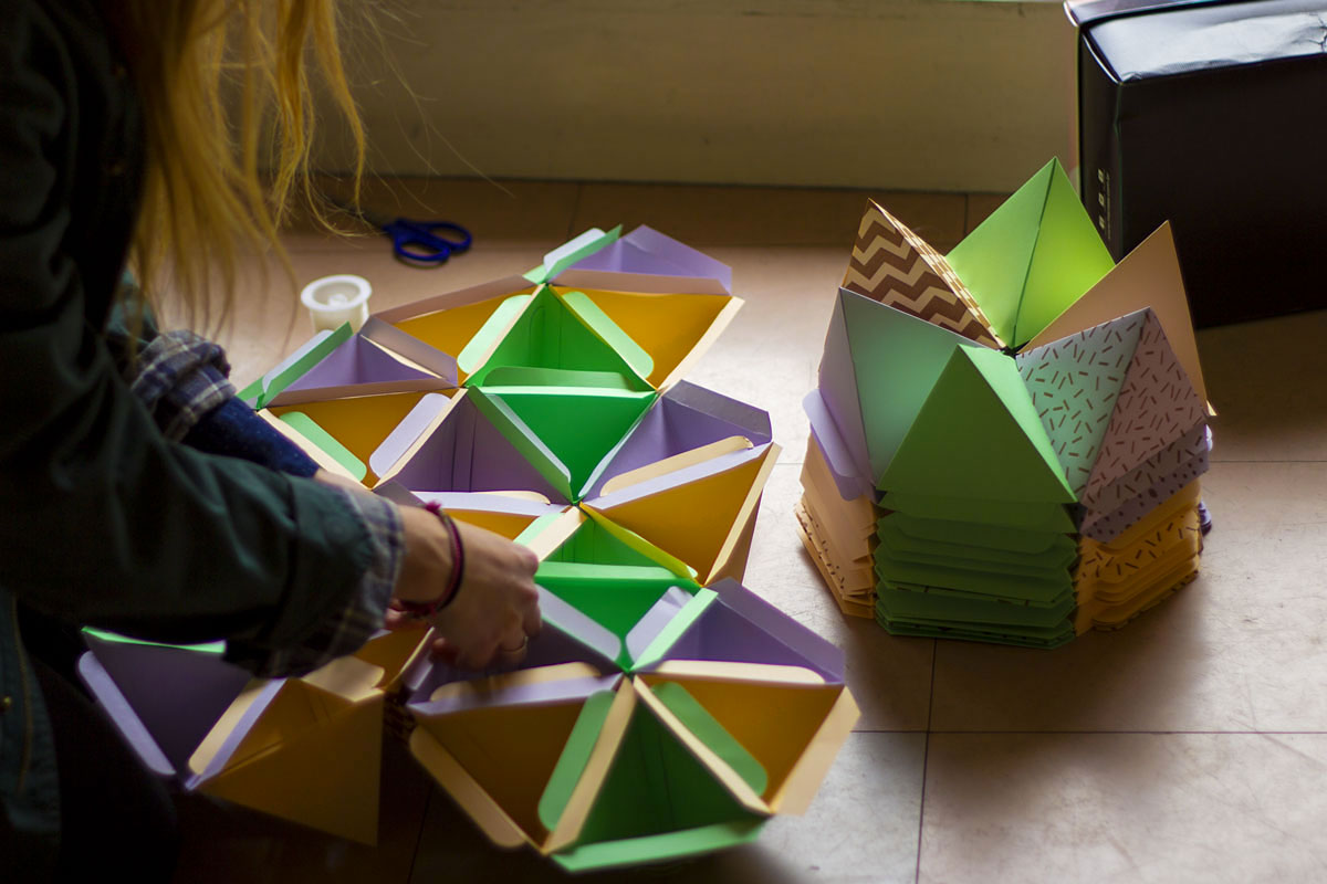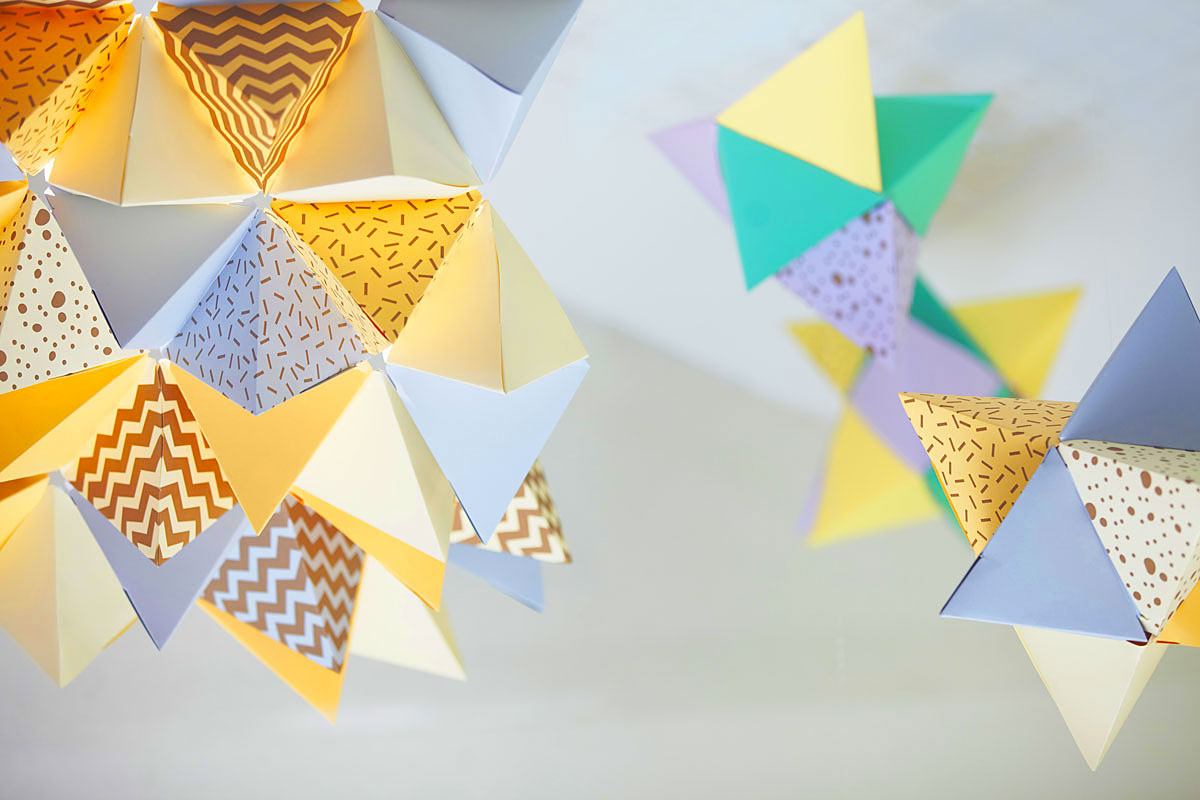 Paper pyramids – Letterpress printed in bronze on Optix 200gsm Copa Green, Reva Green, Zena Grey, Koda Caramel, Loma Buff, Kula Cream, Pati Ochre and Cadi Lilac, custom die cut and scored.