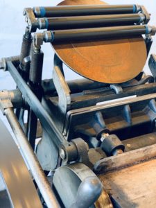 In the workshop we can print on two kinds of presses – our Chandler & Price, which is a hand-fed and foot-treadled platen press, and our Asbern Proof Press, a hand-fed press with electric inking rollers.