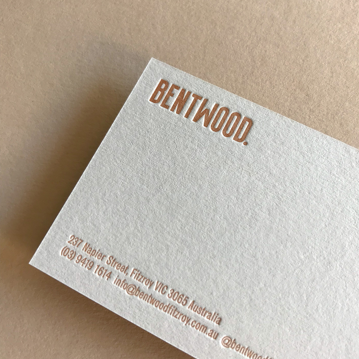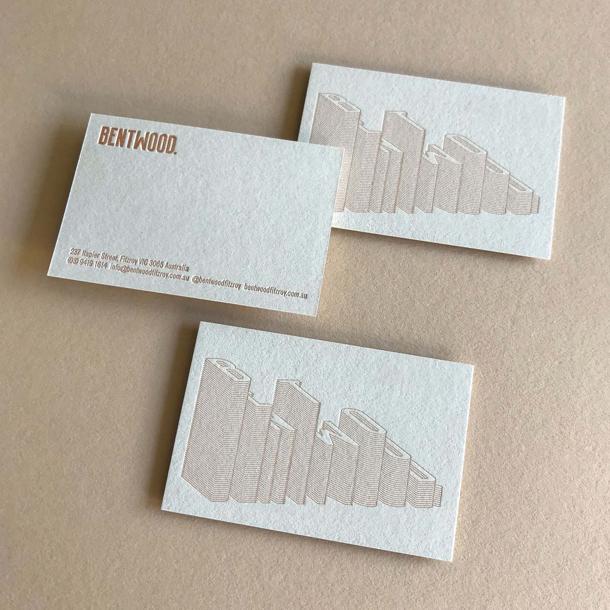 Business Cards – Letterpress printed in one Pantone colour on two sheets of Colorplan Mist 270gsm duplexed to make 540gsm.