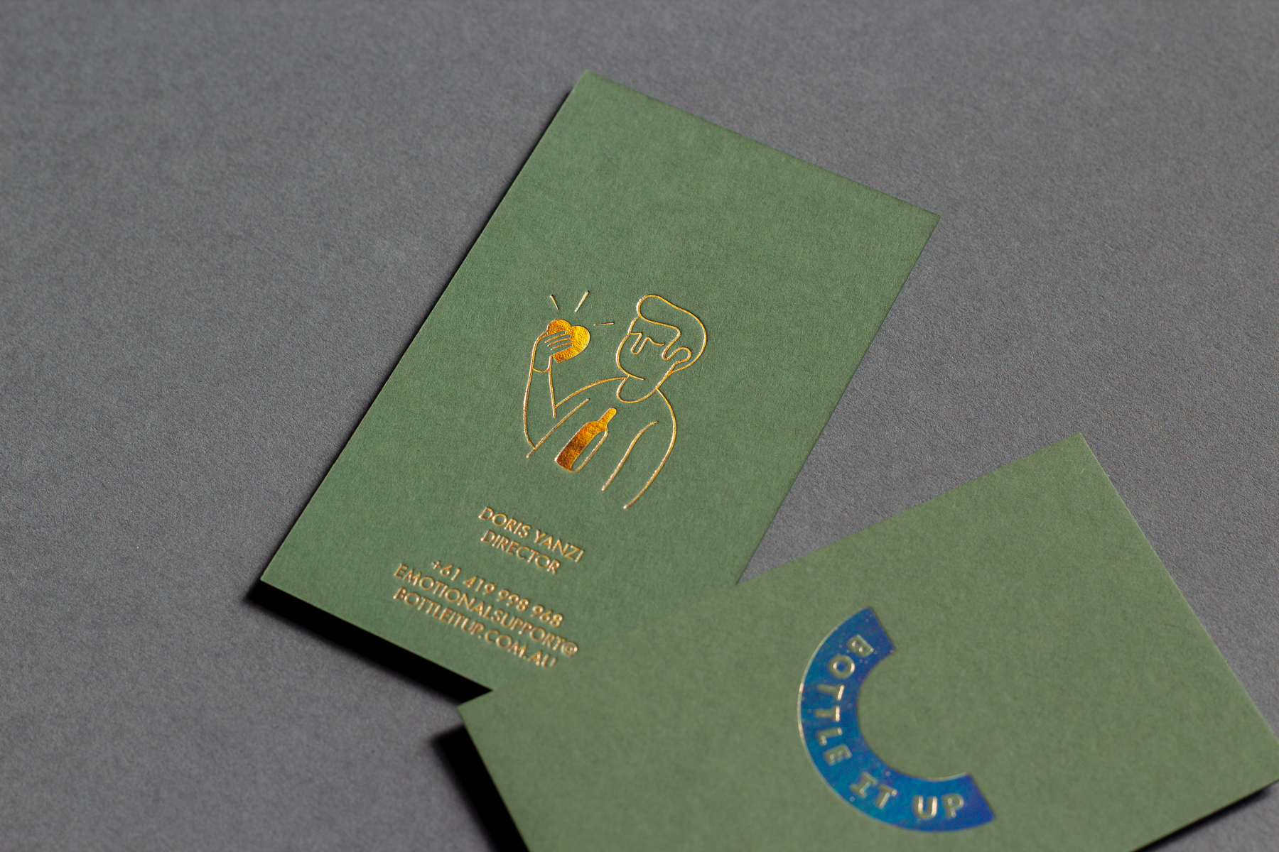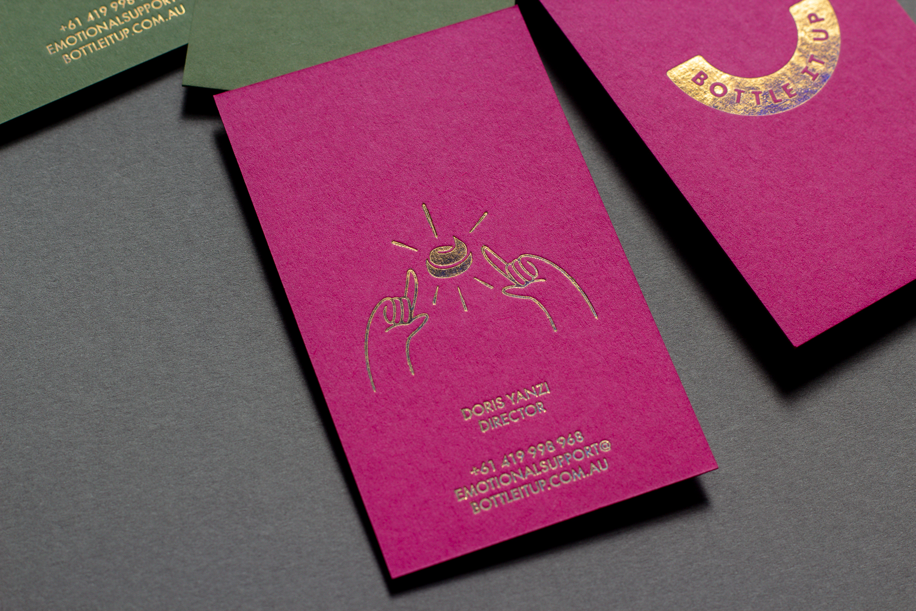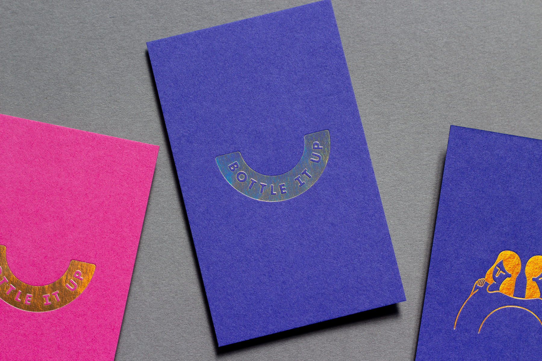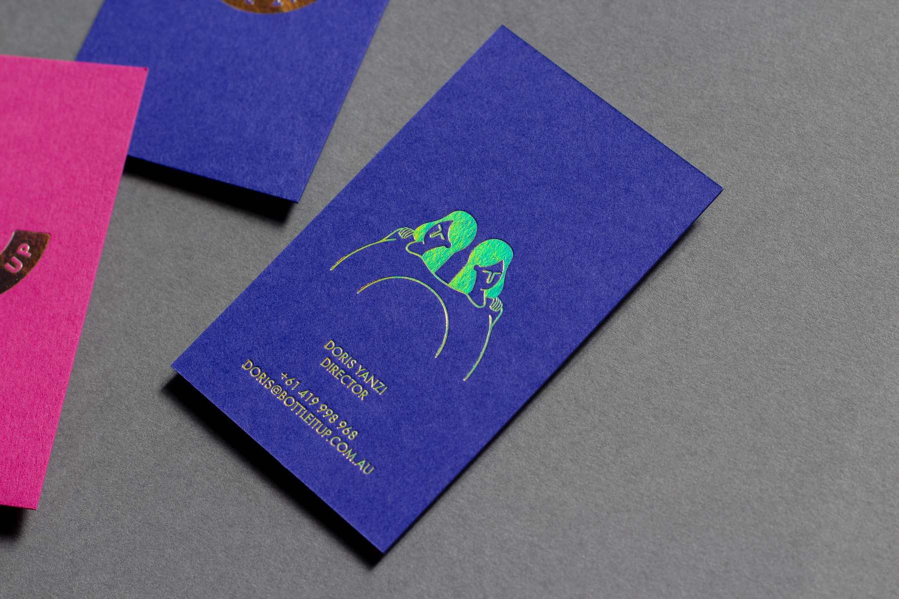 Business Cards – Foil stamped gold rainbow holographic laser on Colorplan Fuchsia Pink, Royal Blue and Mid Green 540gsm.