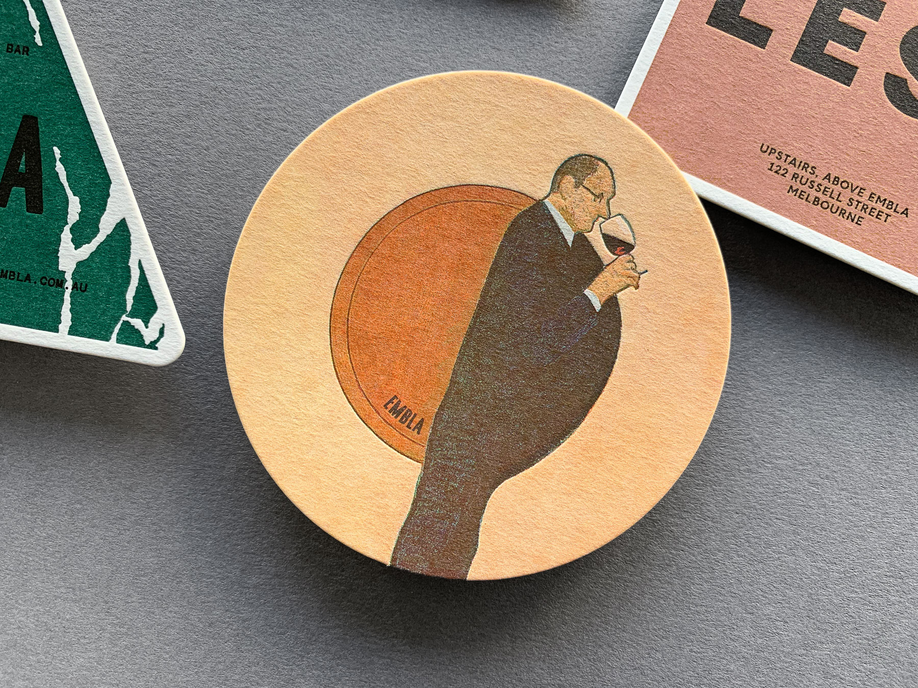 Coasters for Lesa & Embla – Letterpress printed in a three colour halftone / four Pantone spot colours on Beer Matt Board 390gsm and custom die cut.