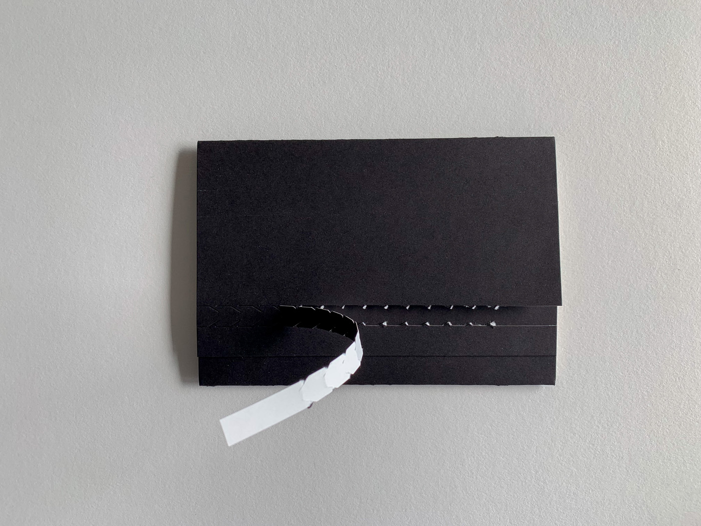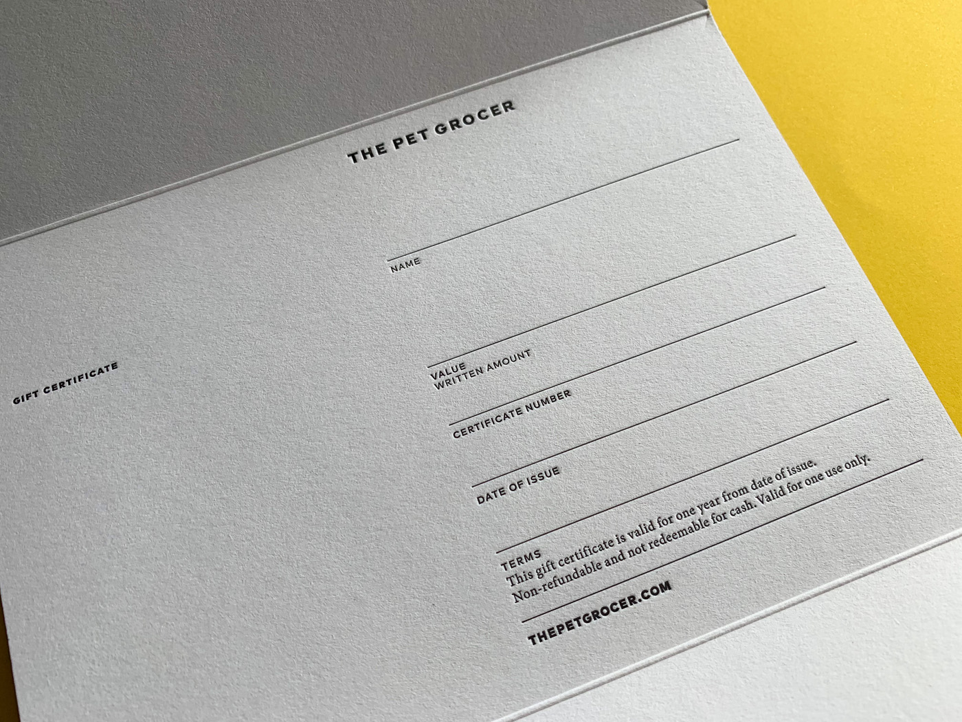 Gift Vouchers – Letterpress printed in black on Stephen Gesso White 250gsm duplexed to Keaykolour Jet Black 120gsm to make 370gsm with a custom die cut and zip perf.