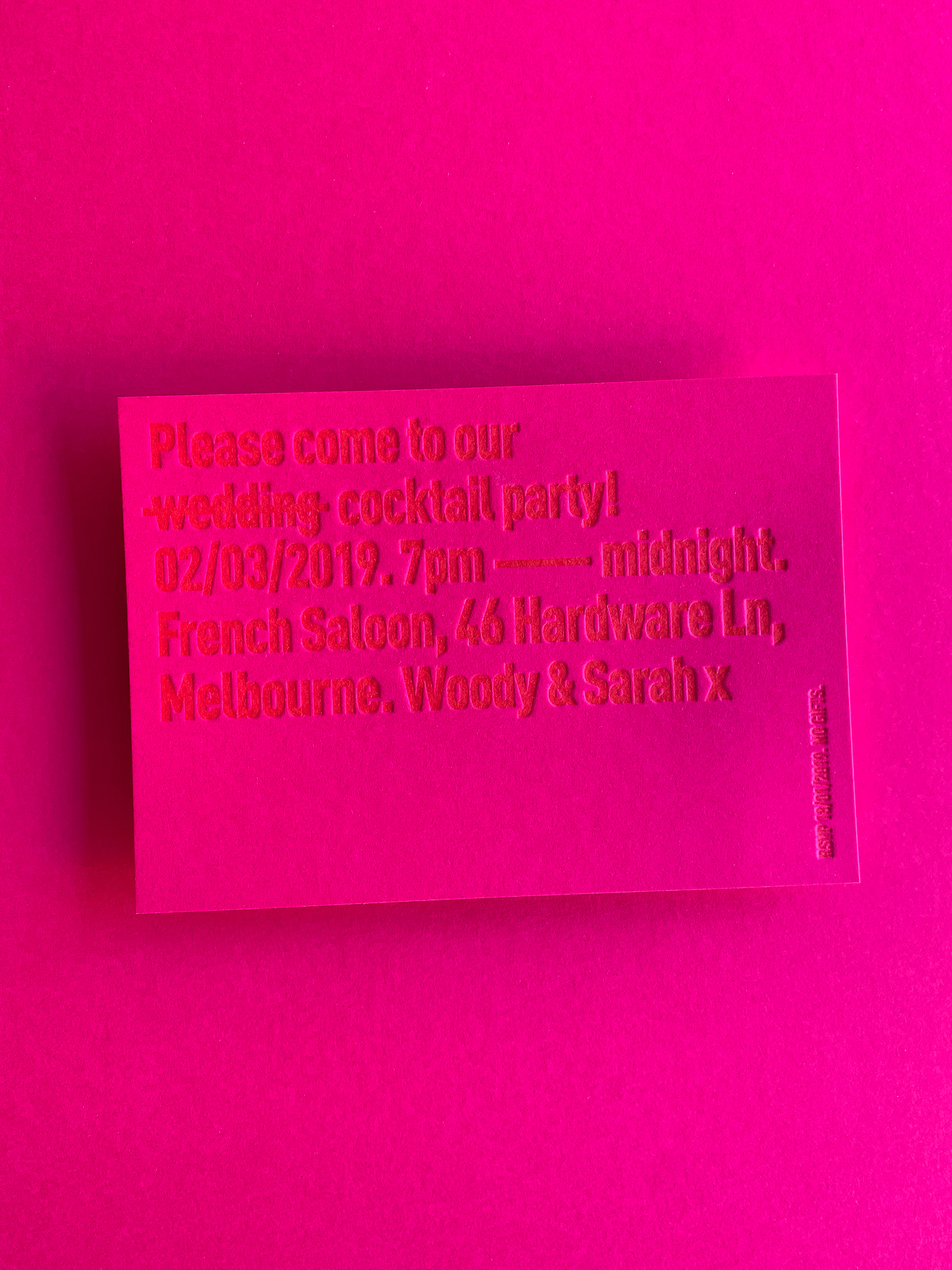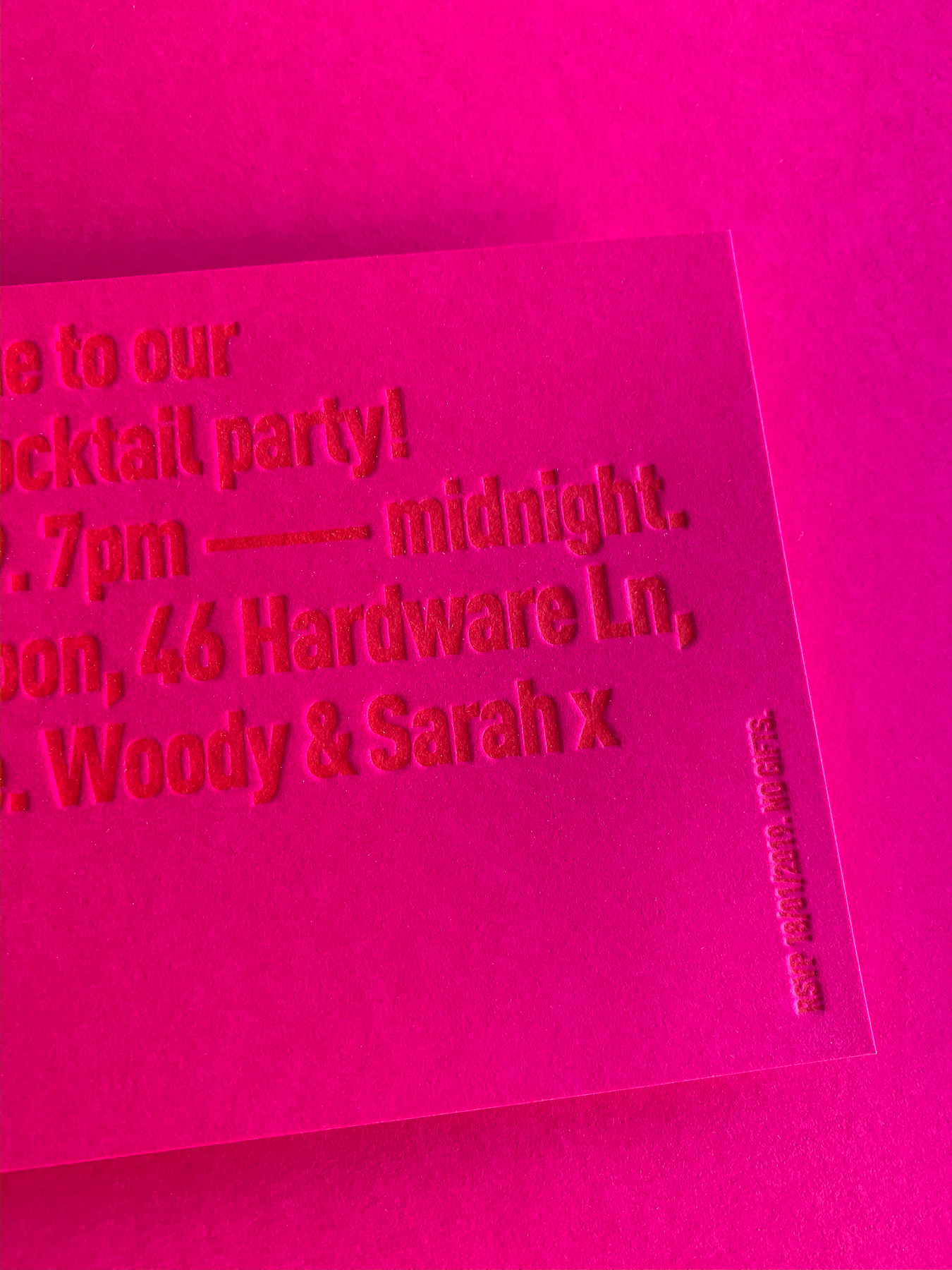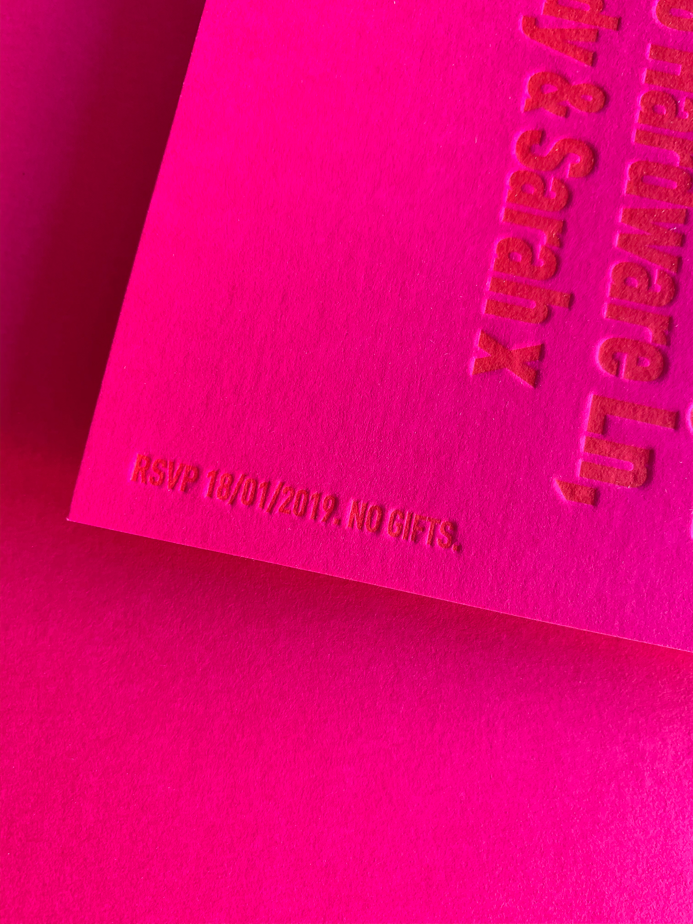Invitations – Letterpress printed in one colour on PopSet Digital Cosmo Pink 320gsm.